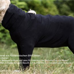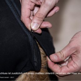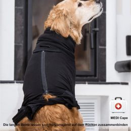 Das Medi-Cape hält ihren Hund auch schön warm. Vor einer Operation wird das Operationsfeld immer rasiert. Durch das fehlende Fell und auch durch Benutzung von Anästhetika kann die Körpertemperatur des Hundes sinken.