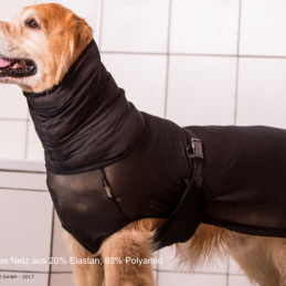 Hochelastisches Netz-Cape aus 80% Polyamid und einem Elastan-Anteil von 20%. Das luftdurchlässige Netzmaterial, ein hoher Kragen und ein enges Anliegen des Capes (wie beim dryup cape) bringt das Fell beim Föhnen optimal in Form!