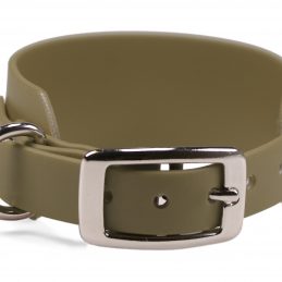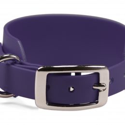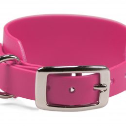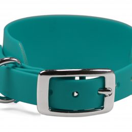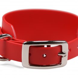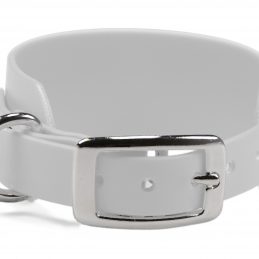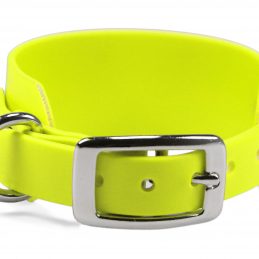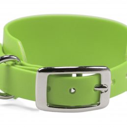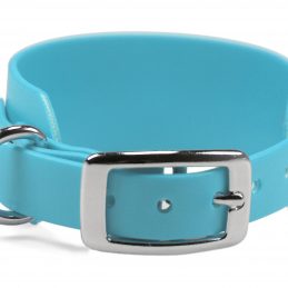 Windhundhalsband aus wasserfester, 38 mm breiter Standard BioThane®. Die Verjüngung auf 19 mm ermöglicht die Verwendung einer kleineren und somit leichteren Doppelstegschnalle, wodurch das Halsband insgesamt wesentlich leichter ist als ein reguläres 38 mm Halsband mit Rollschnalle.